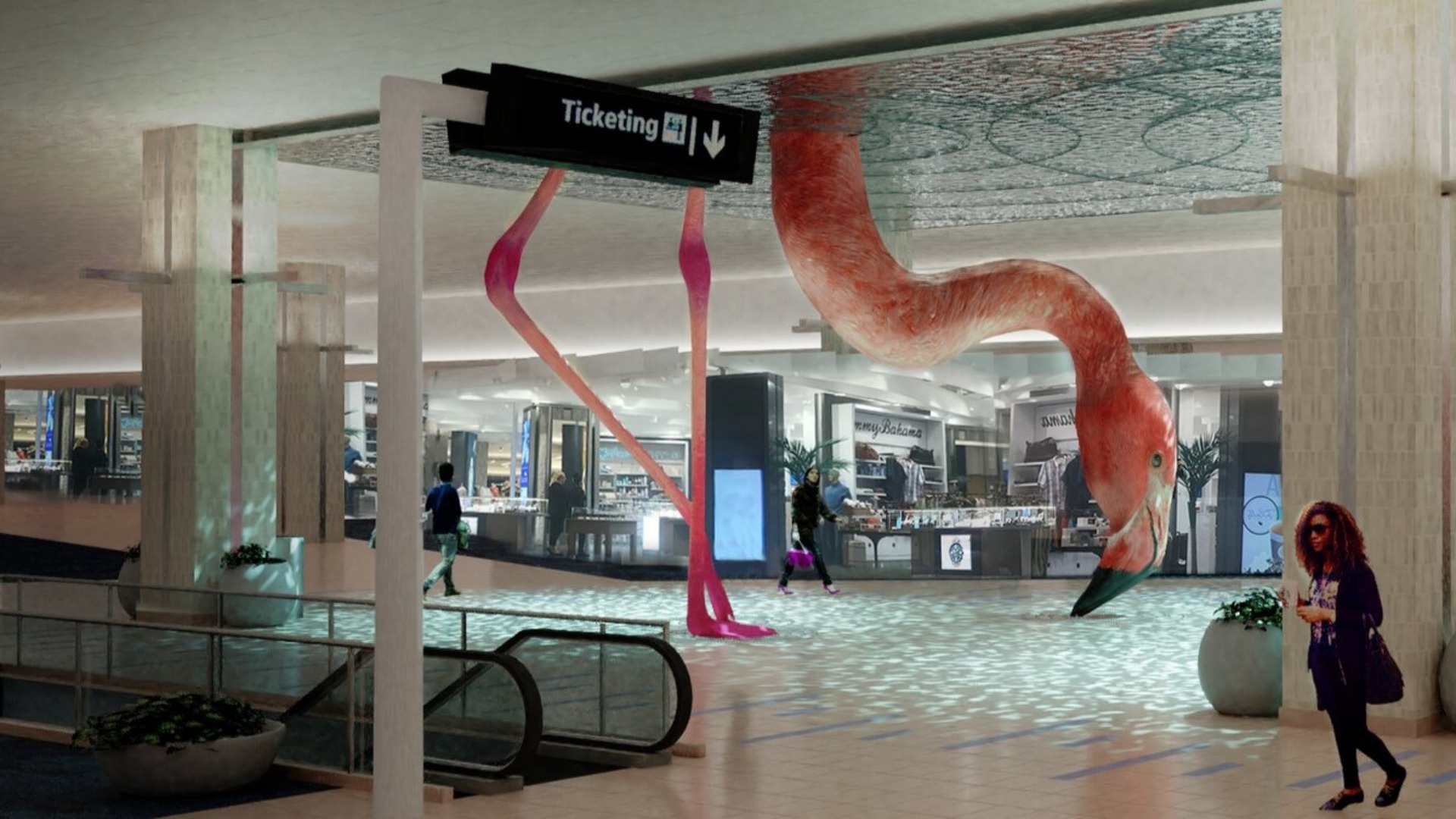 The work welcoming travellers is called “Home” and has been imagined by artist Matthew Mazzotta. The giant flamingo will be displayed in the main terminal.