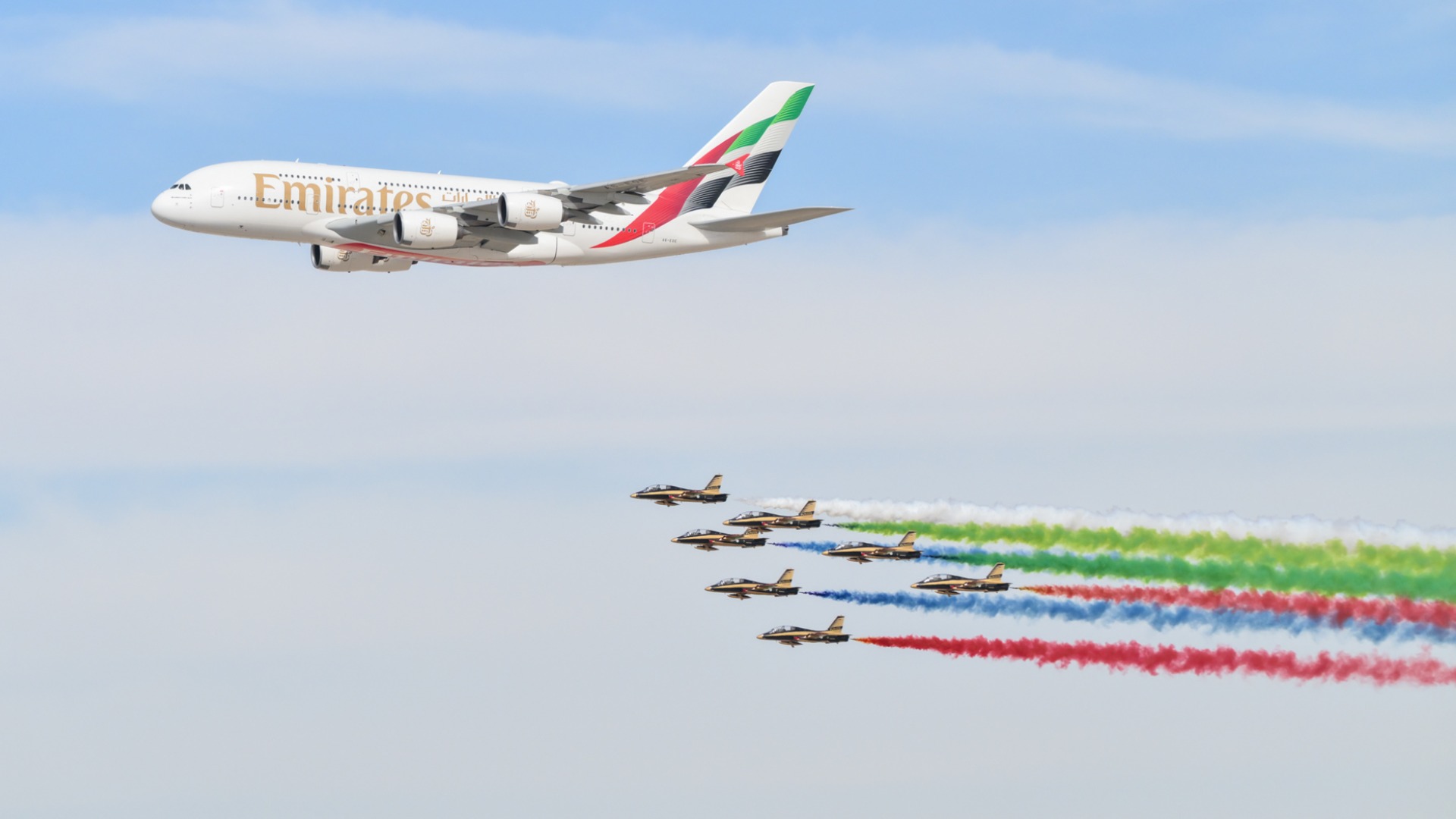 Captain Michael Schreiber, Chief Pilot Technical Operations at Emirates, and Captain Khalid Akram, Deputy Chief Pilot Boeing, were instrumental in overseeing the airline's part of the aerial display, with Captain Mubarak Al Mheiri, Captain Chris Gauchi, and Captain Khalid Binsultan leading the A380, and Captain Dave Kilian, Captain Ali Almarzooqi, and Captain Ali Alyafei commanding the Boeing 777.