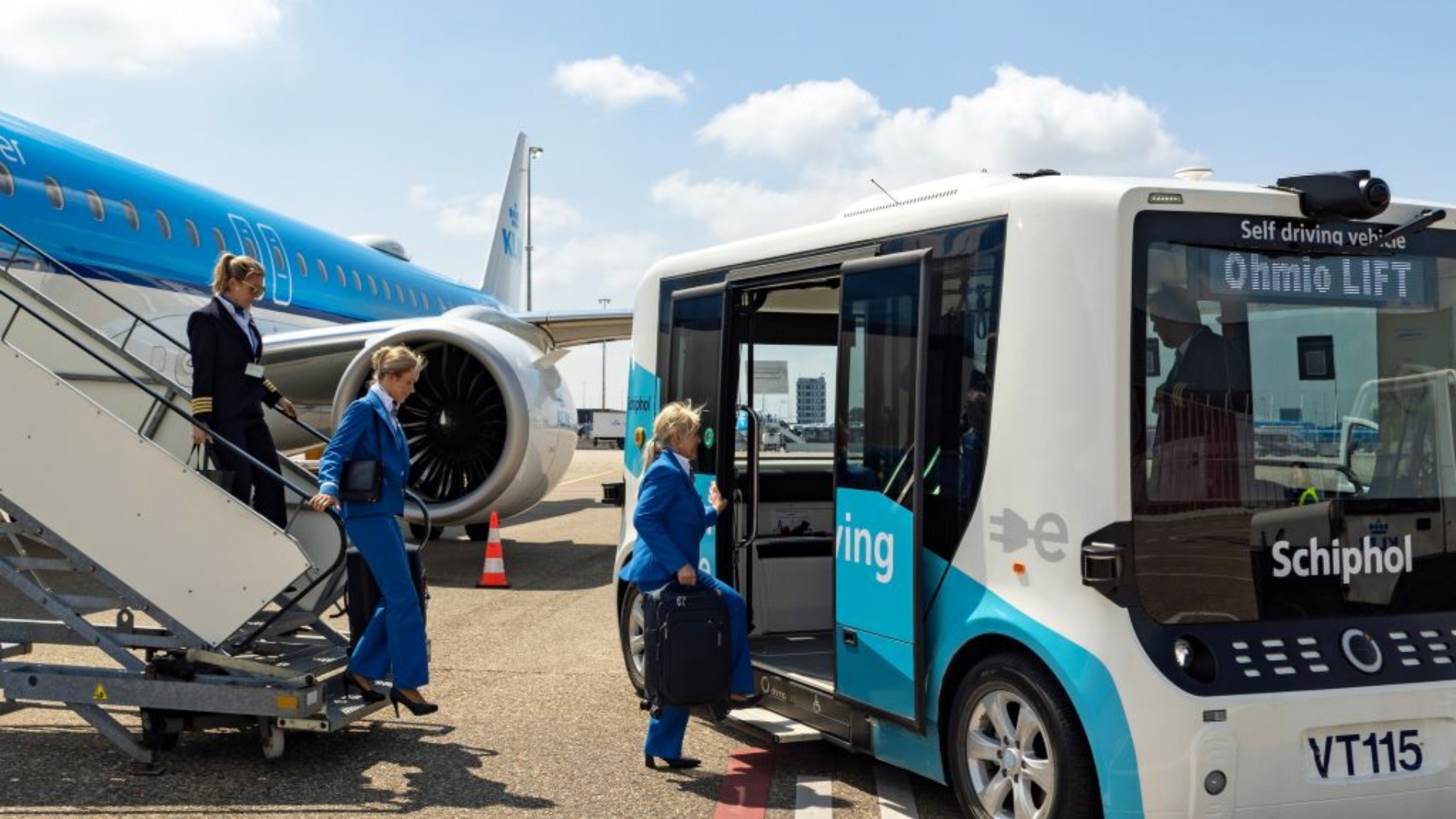 Today marks the beginning of the second phase of trials for electric self-driving shuttles at Schiphol Airport. In collaboration with KLM Cityhopper and KLM Ground Services, the airport is testing a pre-programmed route to and from the apron. This service will transport KLM Cityhopper crew members arriving at Schiphol, following a successful initial trial earlier this year with supplier Ohmio.