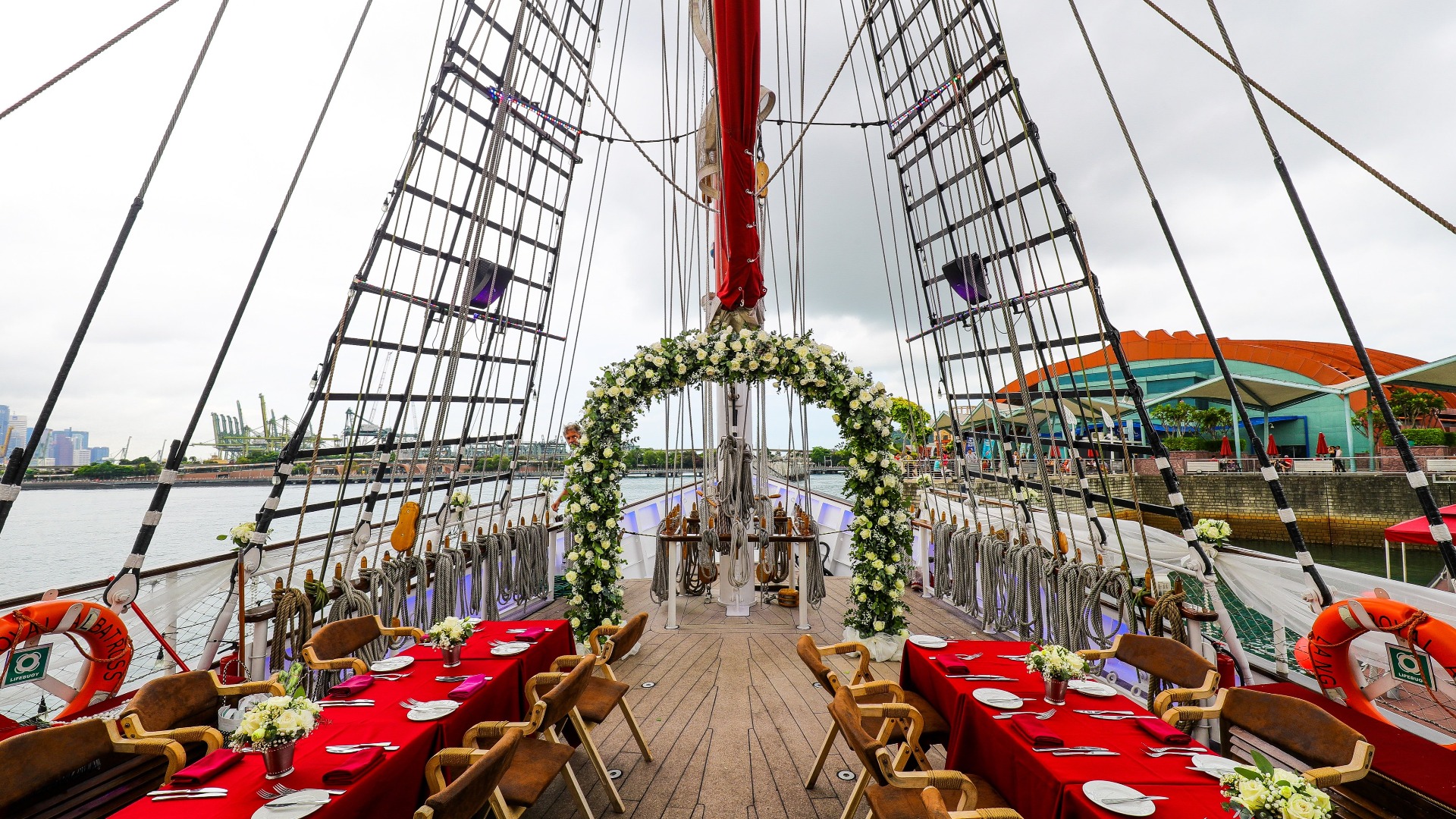 The two-and-a-half-hour cruise on the 47-meter-tall Royal Albatross Singapore welcomes guests' four-legged companions. Guests may enjoy a small fireworks show while they take in the sights of the city skyline as they sail across the island paradise of Sentosa.