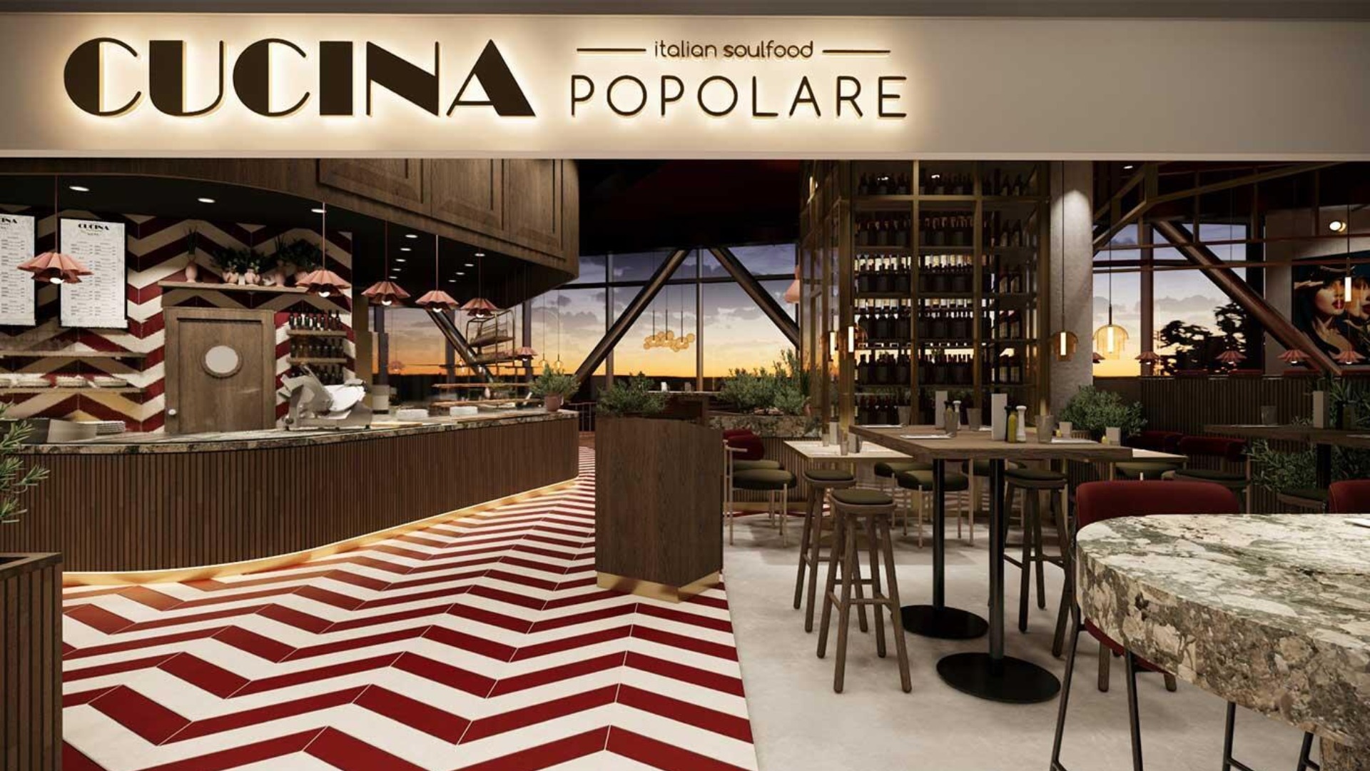 Italian cuisine is represented by Cucina Popolare, which reinterprets traditional Italian dishes such as pizza and pasta while maintaining a focus on authentic flavors and a convivial dining atmosphere. The restaurant can accommodate around 120 guests.
